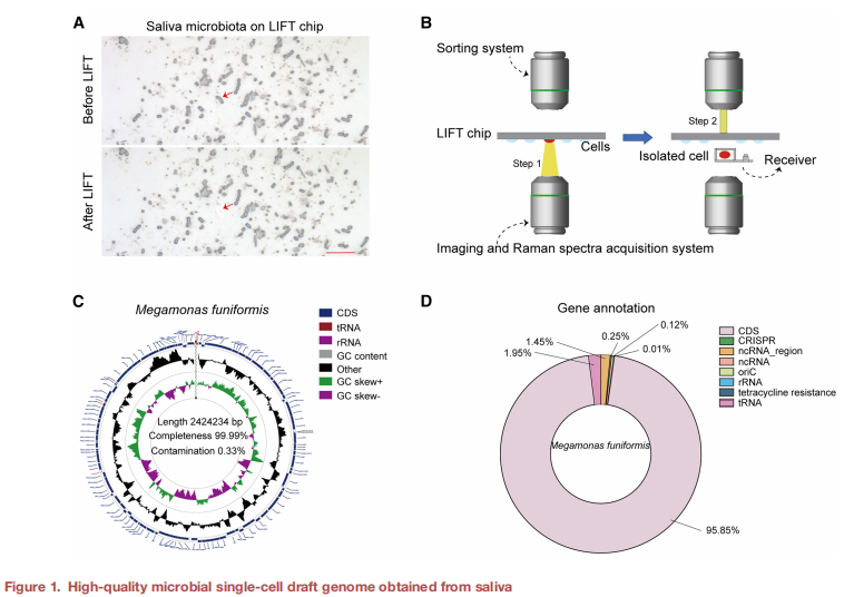从唾液样本中成功分选微生物单细胞,组装获得Megamonas funiformis基因组,完整度达99.99%,污染率仅0.33%,编码密度>90%,达到培养分离株水平。