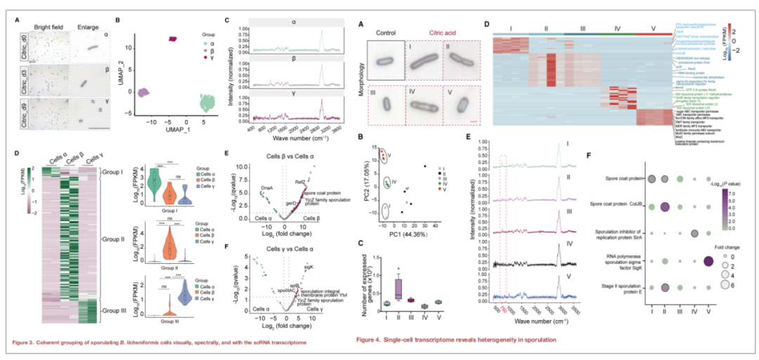 结合拉曼光谱聚类与单细胞转录组,将柠檬酸诱导的地衣芽孢杆菌分为α(杆状)、β(中间态)、γ(孢子)三群,光谱与转录组特征高度一致。该方法不依赖于参考基因组(可进行从头组装),因此既可应用于模式菌,也完全适用于未知或不可培养微生物的研究。