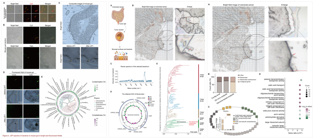 本研究最具突破性的成果,在于将微生物单细胞组学分析从液体或匀质化样本,拓展至宿主组织内部。成功对定居在小鼠肠道和人类结直肠癌组织切片中的微生物,进行了高精度单细胞分离与原位基因组/转录组测序,首次在真正意义上实现了“在原生微环境中,聆听单个微生物的故事”。