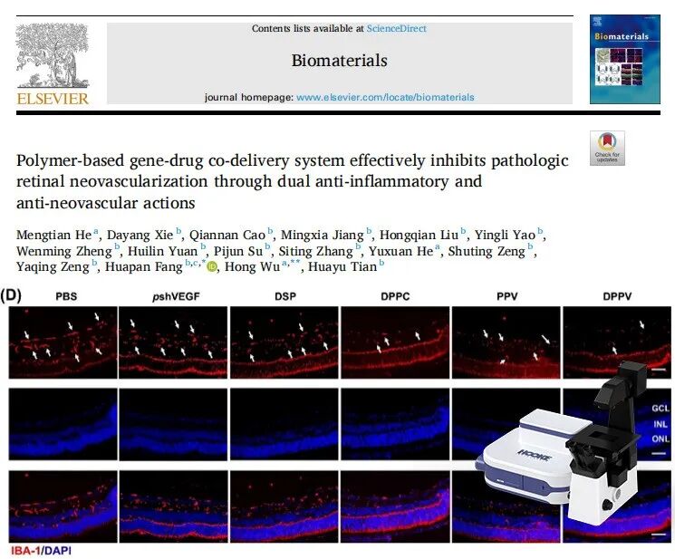 2025 年,吉林大学第二医院吴宏教授团队联合厦门大学研究团队,在《Biomaterials》期刊(影响因子12.9)发表研究论文《Polymer-based gene-drug co-delivery system effectively inhibits pathologic retinal neovascularization through dual anti-inflammatory and anti-neovascular actions》。该研究构建了一种聚合物基因–药物共递送系统,在氧诱导视网膜病变模型中,通过同步抑制血管新生与炎症反应,有效改善病理性视网膜新生血管相关改变。在研究过程中,视网膜整体铺片及切片样本的多标记免疫荧光成像是评估治疗效果与作用机制的重要手段。相关免疫荧光图像由 S3000 超快三维荧光成像系统完成高效采集,为本研究结论提供了关键的高质量成像支持。