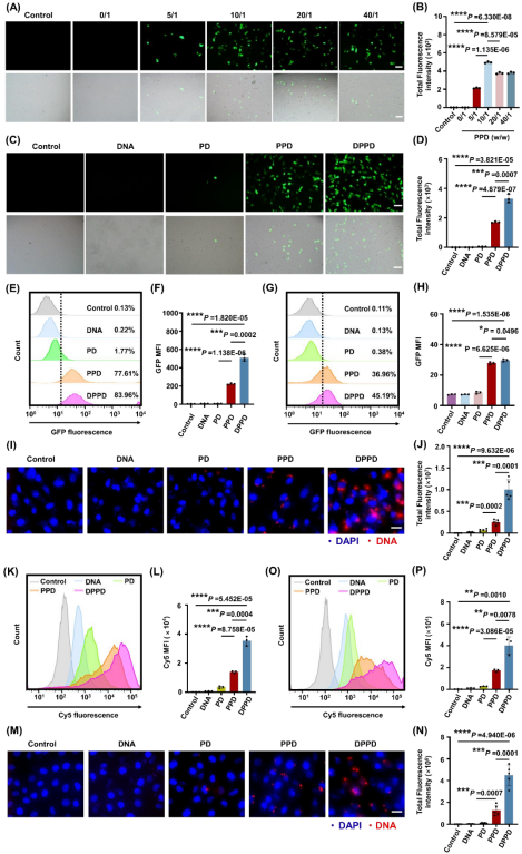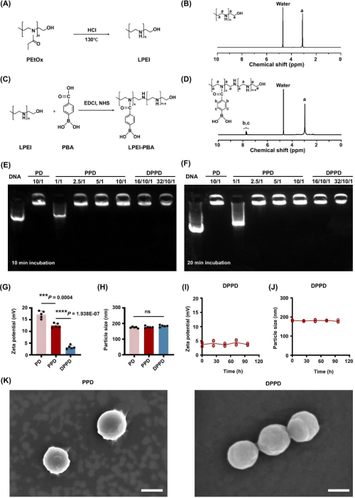 研究首先对共递送体系的构建过程及理化性质进行了表征。结果显示,苯硼酸修饰的线性聚乙烯亚胺可有效负载质粒DNA,并与地塞米松磷酸钠自组装形成稳定的三元复合物。