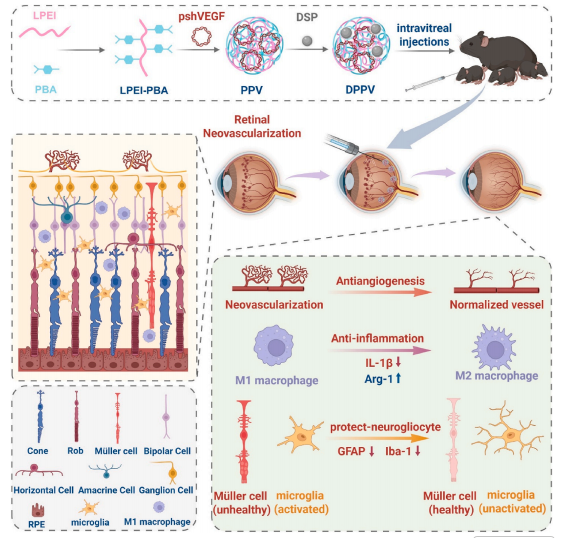 研究团队设计并构建了一种聚合物基因–药物共递送系统(DPPV)。该体系以苯硼酸修饰的线性聚乙烯亚胺(LPEI-PBA)作为基因载体,负载靶向 VEGF 的 shRNA 质粒(pshVEGF),并协同递送地塞米松磷酸钠(DSP)。研究通过体外实验评估该体系的理化性质、基因转染效率、生物相容性及抗血管生成能力;在体内实验中,构建氧诱导视网膜病变(OIR)小鼠模型,通过单次玻璃体腔注射评估其对病理性视网膜新生血管及炎症反应的抑制效果,并结合组织学与免疫荧光分析进行验证。